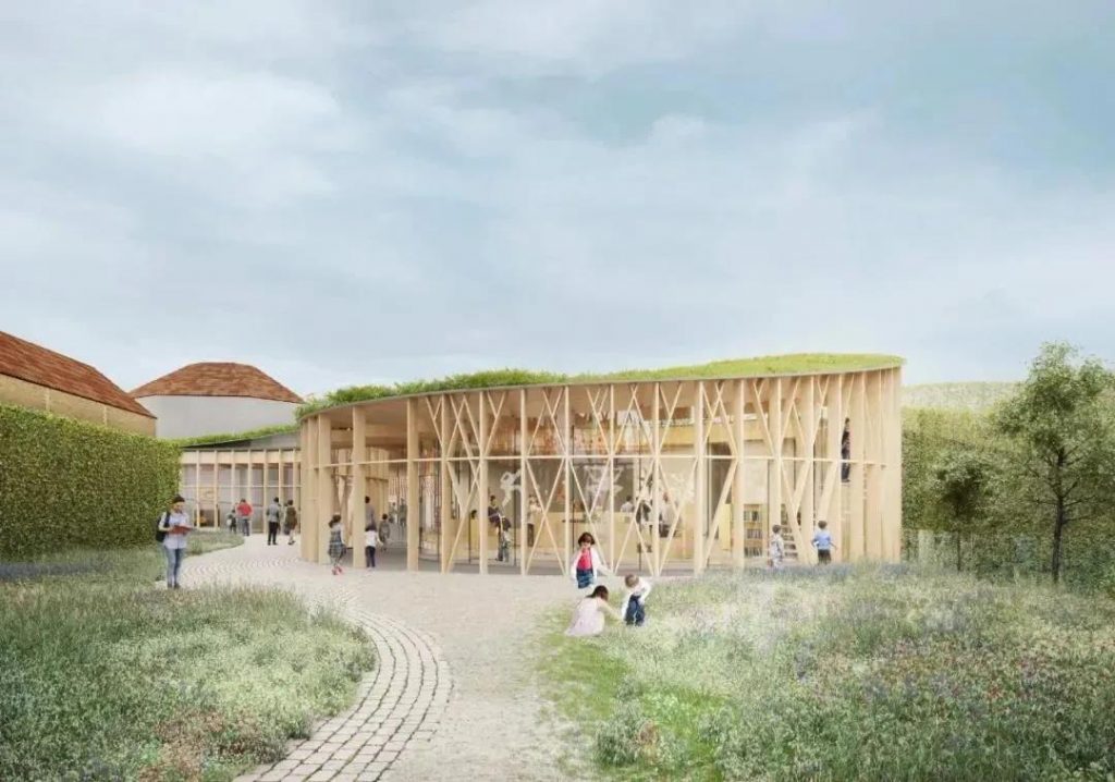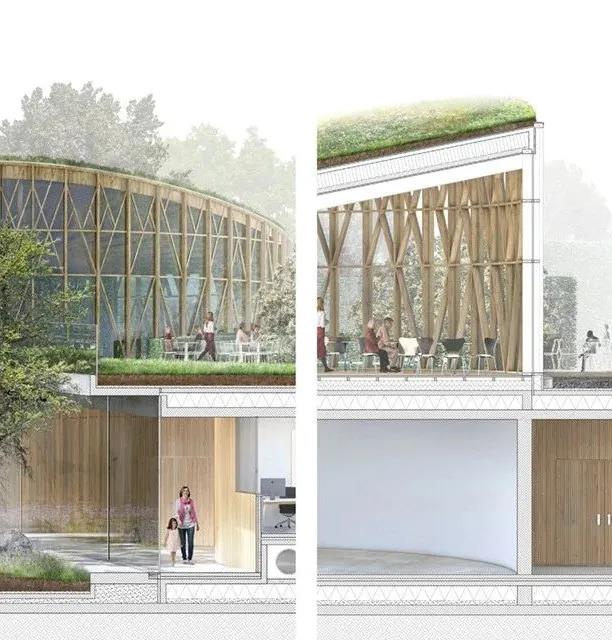 在原本紅瓦白墻、平面排列的方方正正的小鎮(zhèn)中,隈研吾插入了一個個用玻璃和木材圍護的圓柱體,共占地9000㎡,地面和屋頂都種滿了綠色植物。從小鎮(zhèn)的上空俯瞰,就像中央種了一棵棵茂密的大樹。
