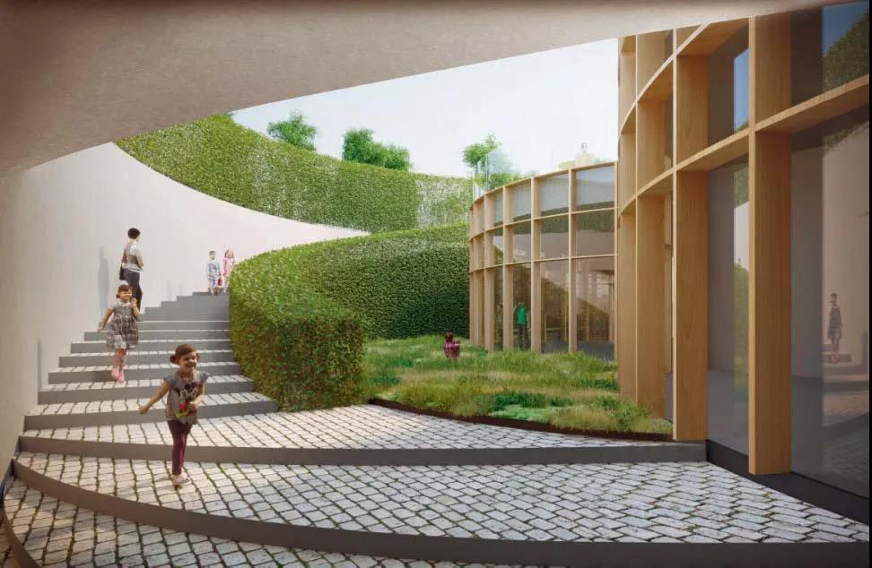 博物館的三分之二位于地下,作為展覽空間。通過一系列像洞一樣的下沉花園連接到上面的花園,露出玻璃和木格做成的幕墻,如同從童話世界到外面世界的“門戶”。